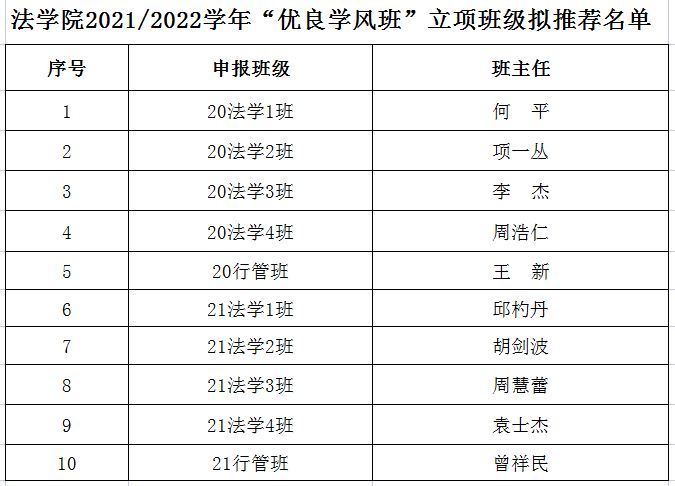 根据av天堂 2021/2022学年“优良学风班”立项申报工作的通知要求,经班级申报、av天堂 初步审核,现决定对20法学1班等10个班级进行立项拟推荐,现将结果予以公布。公示期为2022年3月22日-3月28日,联系地址:av天堂 一楼事务大厅,联系人:谢老师,联系电话:0577-86680919。