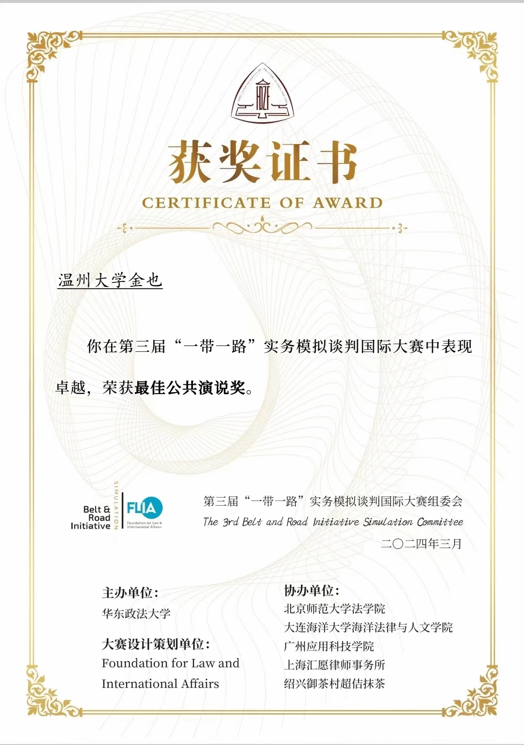 本次比赛主要由华东政法大学主办,为全英文谈判比赛,国内共有65个高校参加,以及来自9个国家的留学生参赛,参赛队伍包括华东政法大学、西南政法大学、复旦大学、武汉大学、中国人民大学、厦门大学等名校。在强者林立的赛场上,av天堂 代表队通过激烈角逐取得了团体三等奖,国际经贸规则专业22级学生金也因优秀的赛场表现荣获最佳公共演说奖,国际法系李娟老师荣获最佳教练奖,此次我校共获3项奖项。