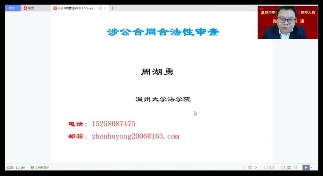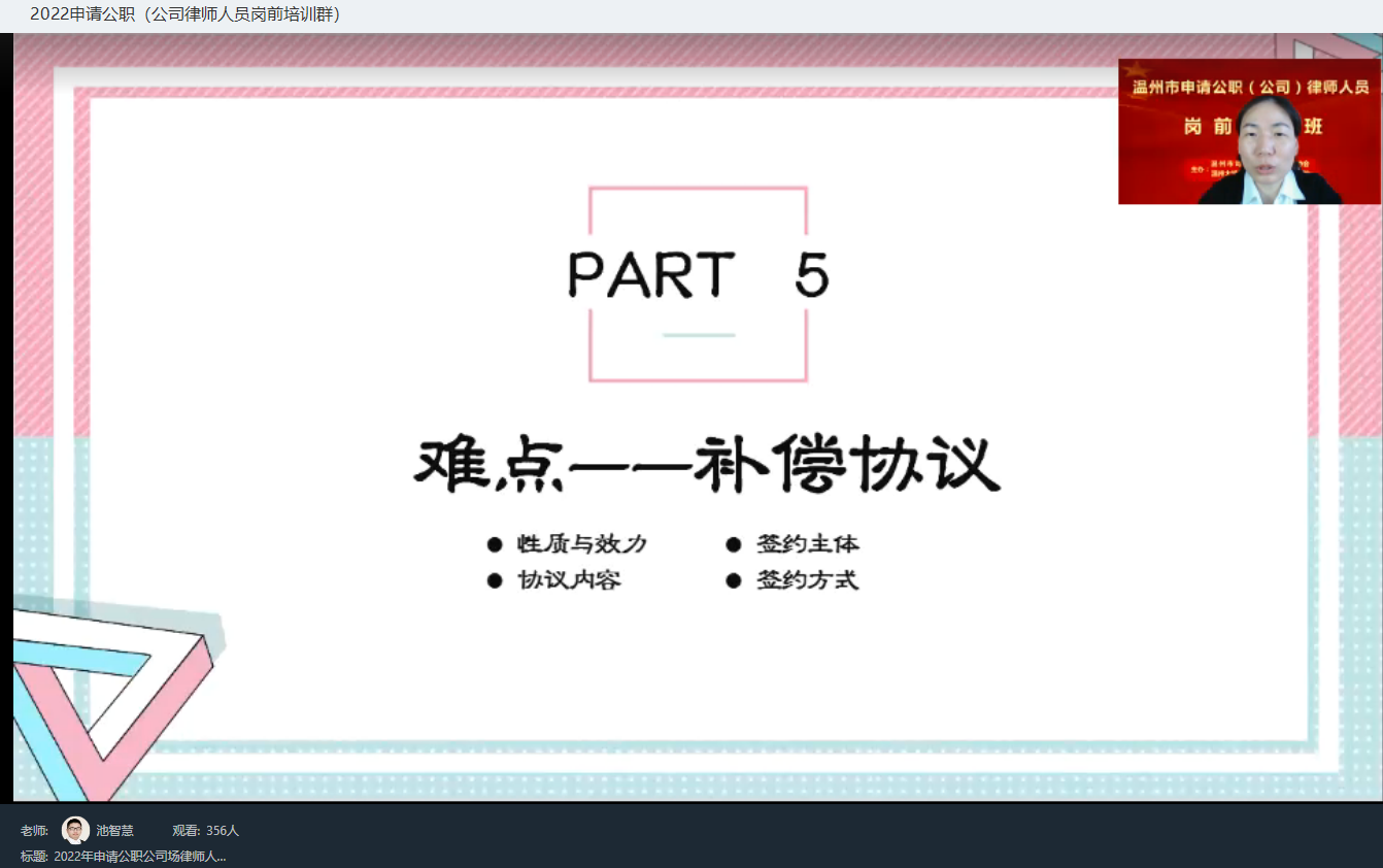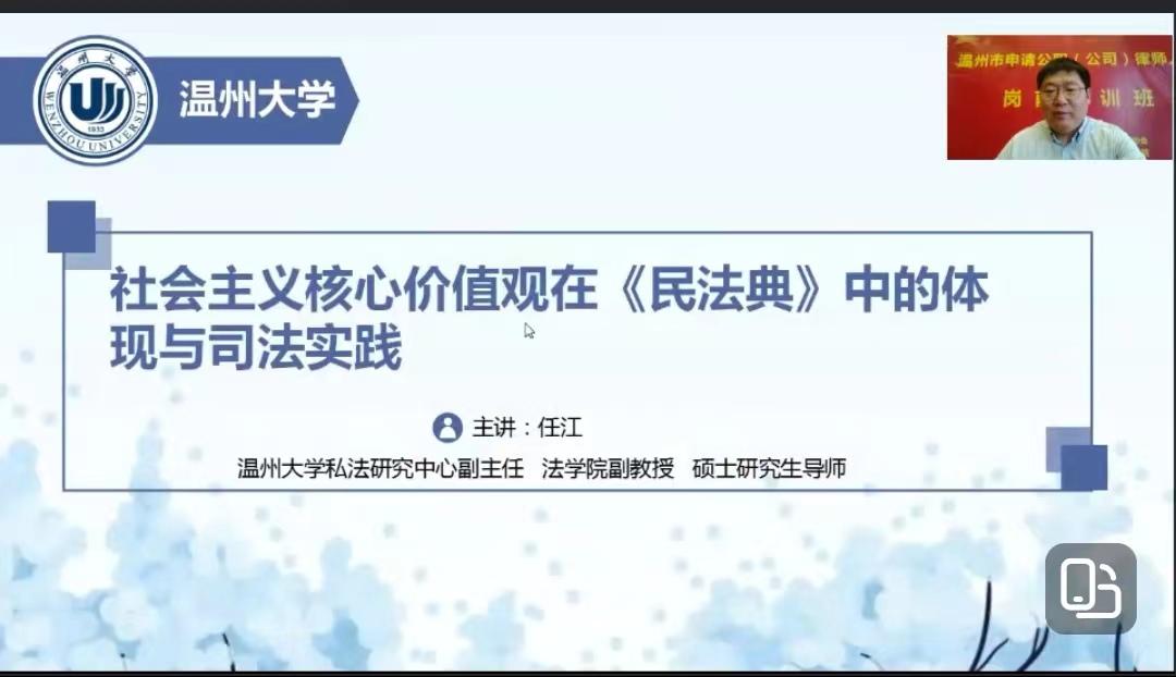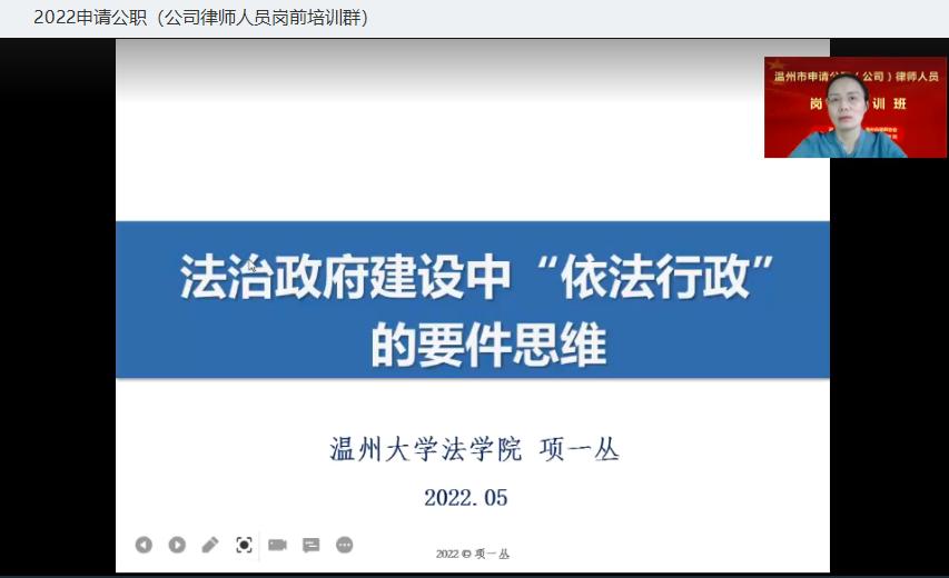 5月5日至5月7日,温州市司法局、温州市律师协会、av天堂 和瓯越律师av天堂 联合举办了2022年温州市申请公职(公司)律师人员岗前培训班。本次培训通过钉钉软件以在线直播方式开展,全市符合申请公职(公司)律师条件的人员共400余人参加。