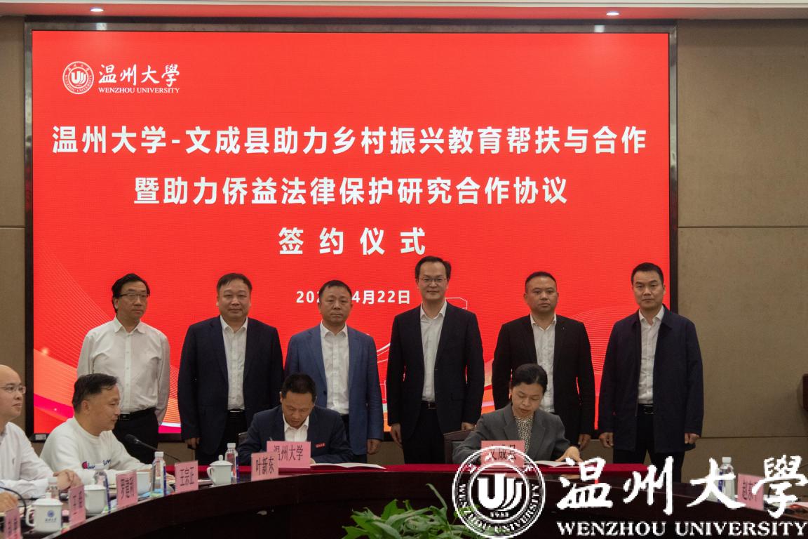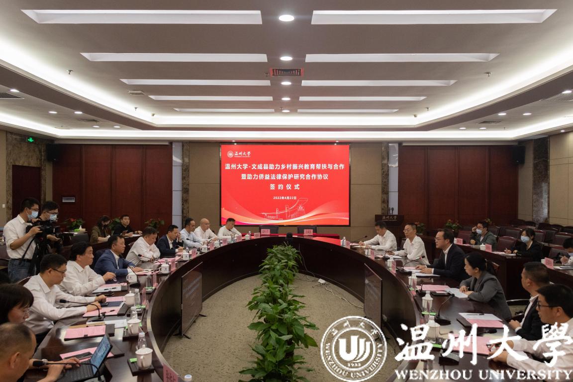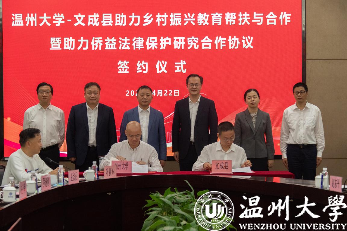 4月22日下午,av天堂 -文成县助力乡村振兴教育帮扶与合作暨助力侨益法律保护研究合作协议签约仪式在我校举行。校领导谢树华、赵敏、蔡曙光、王舜,文成县县委书记刘中华、副县长吴可塑等领导出席仪式。赵敏主持。