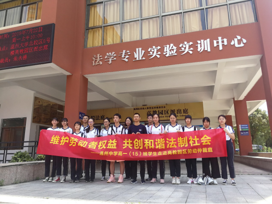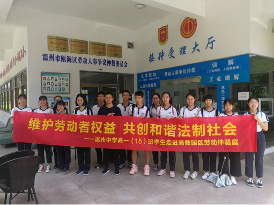 7月25日上午,温州中学高一(15)班学生一行14人来到温州市瓯海区劳动人事争议仲裁委员会高教园区派出庭参观学习。我院教师、派出庭庭长柯宇航博士予以了热情的接待,向前来参观学习、开展暑期社会实践活动的高一学子们表示热烈的欢迎。
