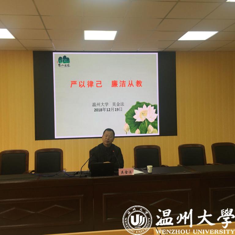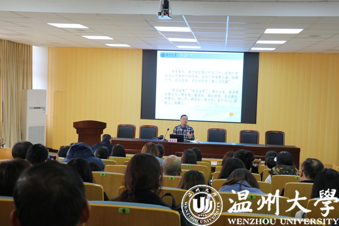 2018年12月19日下午,av天堂 在北校区法政楼301报告厅召开了全院教职工大会和专题政治学习会。校党委委员、纪委书记吴金法做《严以律己,廉洁从教》专题讲座,校党委委员、宣传部长潘玉驹做《牢牢把握意识形态工作领导权主动权》专题讲座。本次讲座由法政av天堂 书记林钦主持,保卫处、音乐av天堂 与法政av天堂 全体教职工及av天堂 研究生党员、预备党员及入党积极分子参加学习。