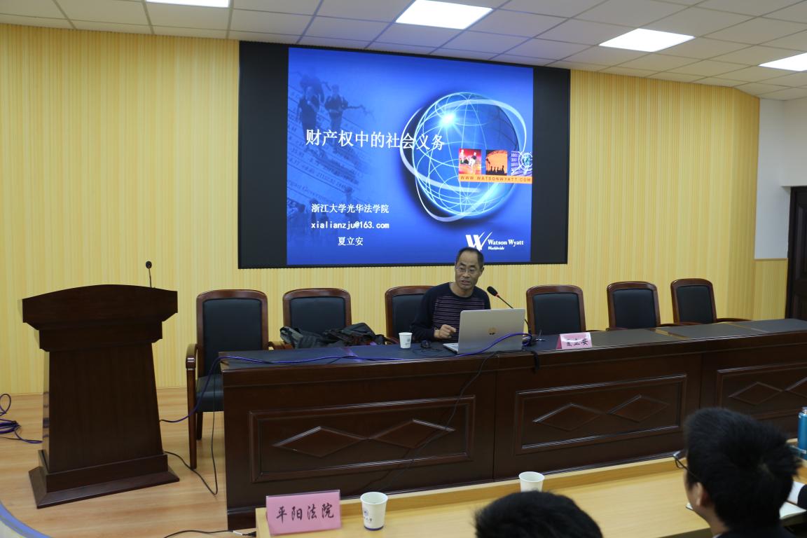2018年12月14日周五下午1点半,在av天堂 法政av天堂 301报告厅,浙江大学光华av天堂 夏立安教授以《财产权中的社会义务》为主题展开了一场精彩的讲座。本次讲座由王宗正院长主持,有来自包括温州法律实务界的法官、律师、检察官,以及av天堂 研究生、本科生等,济济一堂,共享夏立安教授所带来的这场学术盛宴。