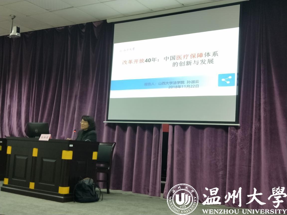 讲座开始前,孙淑云教授对我校瓯海区劳动人事争议仲裁委员会高教园区派出庭进行参观,对派出庭的工作以及建设予以充分的肯定与认可,并希望山西大学也能够引进相应的改革。讲座伊始,孙淑云教授从问题提出、回观纵览、本土贡献、冷静审视和前瞻展望五个方面向我们展示了中国医保的“前世今生”,一直从改革开放以来到中国医保体系的逐渐形成以及一系列发展成就,她提出全国医保的现状是制度不行、体系不平衡所造成的,以问题为导向是当今世界的问题。孙淑云教授向我们清晰的展示了四十年来中国医保体系的发展脉络,并指出医保与体制的关系是医保制度嵌入社会经济结构性改革过程,为我们构建了现代医保建设的四维图景:从探索到社会基本医保体制建成;从覆盖城镇职业到覆盖全民;从法定基本医保到多层次医保构建;从城乡医保分割建制整合城乡医保。对此四维图景进行了深入浅出的介绍与结合,孙淑云教授得出这样的一个结论:医保体系的完善需要地方自发整合加之顶层政策推进整合,中国立法就是部门利益争夺的结果。
