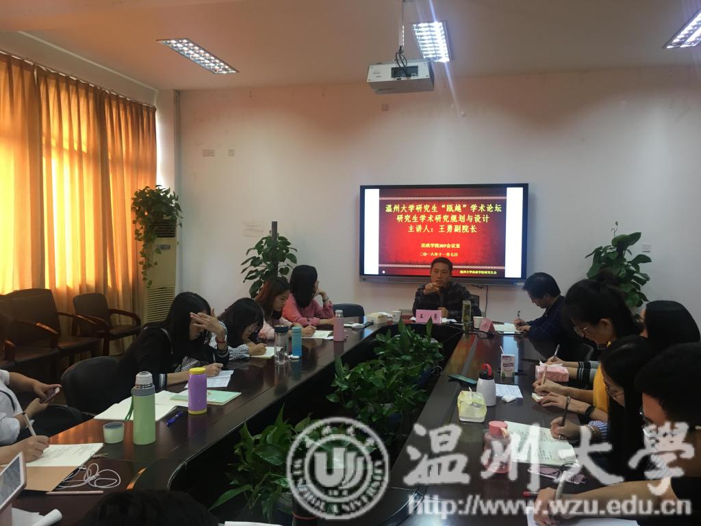 2018年11月7日下午14时,av天堂 研究生“瓯越”学术论坛在法政av天堂 av天堂 307教室举行。此次论坛由法政av天堂 王勇副院长主讲,由法政av天堂 研究生辅导员邓昌云老师主持,法政av天堂 2017级及2018级部分研究生参加了本次讲座。本次论坛主要从如何安排研究生学习生活、如何研究性学习以及如何申报课题三个方面展开讨论。
