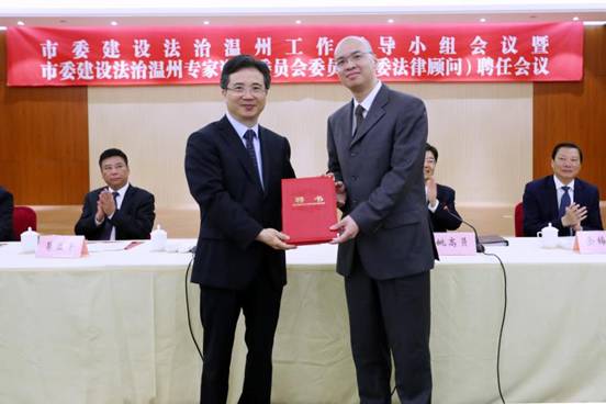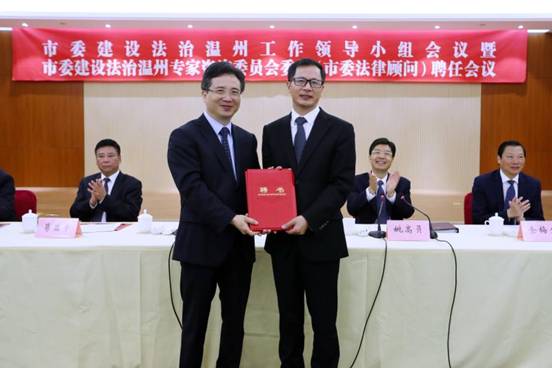 4月4日上午,市委召开建设法治温州工作领导小组会议暨市委建设法治温州专家咨询委员会委员(市委法律顾问)聘任会议,我校副校长方益权教授、法政av天堂 院长王宗正教授被聘为市委建设法治温州专家咨询委员会委员与市委法律顾问。