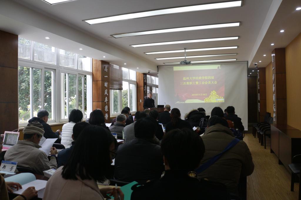 2018年1月19日下午2:30,法政av天堂 全体教工在av天堂 报告厅召开了第四届三次教职工暨工会会员大会,大会由林钦书记主持,全体教工参加。