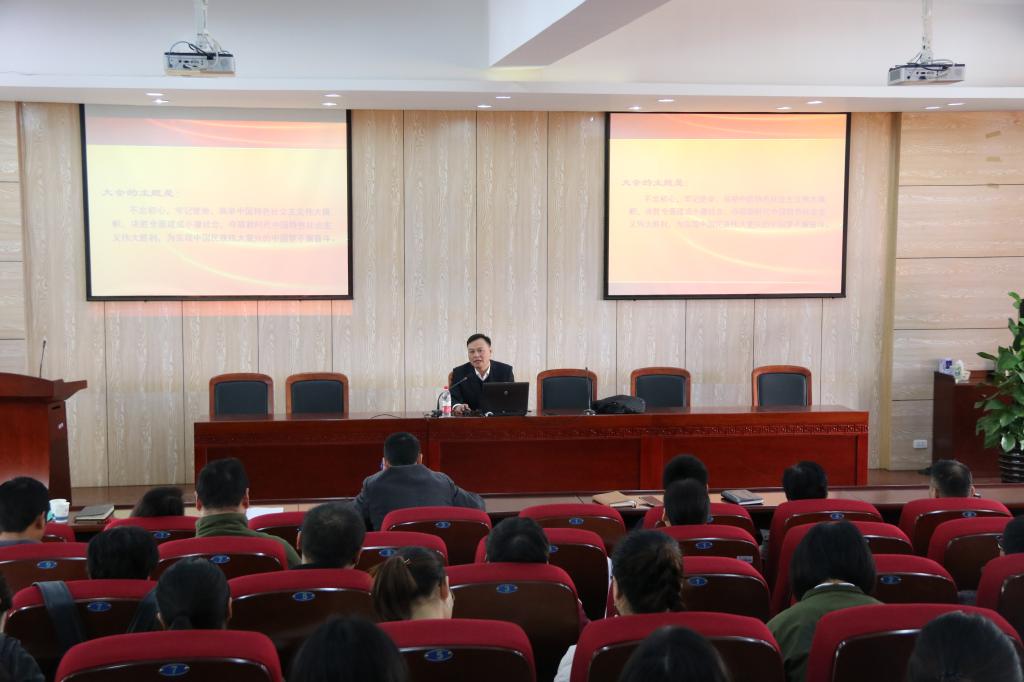 2017年11月22日下午,在人文av天堂 报告厅举行了法政av天堂 与体育av天堂 全体教工和研究生学习会,邀请我校党委委员,宣传部部长潘玉驹作学习十九大报告精神的辅导讲座。