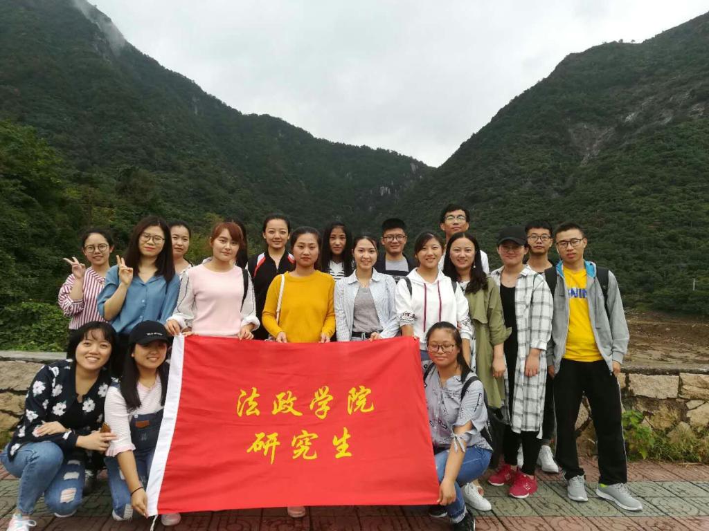 从山脚下开始攀登,道路微陡,难度稍加,但同学们仍然兴致盎然,欢声笑语。期间虽有惫倦,但都能一鼓作气,互相帮助以抵达山腰。这不仅体现出当代大学生百折不屈的拼搏精神,也能反映出法政研究生们敢于吃苦,勇于奋斗的良好气质。此时,细雨转大,行程还远,但同学们未言放弃,坚定目标,在雨中继续前行。大家这种风雨无阻,敢于探索的品格正是研究生的学习生活中必不可少的宝贵要求。随着时间推移,在互相鼓励之间,我们一行终于到达了此行的最后目的地——龙脊。在此眺望,俯仰之间,风景皆收于眼底。苍山翠林,烟雨朦胧,小河潺潺,蜿蜒流转。同学们流连忘返,用手机记录了这惊艳的时刻。感叹唯有坚持到底,才可领略无限风光。