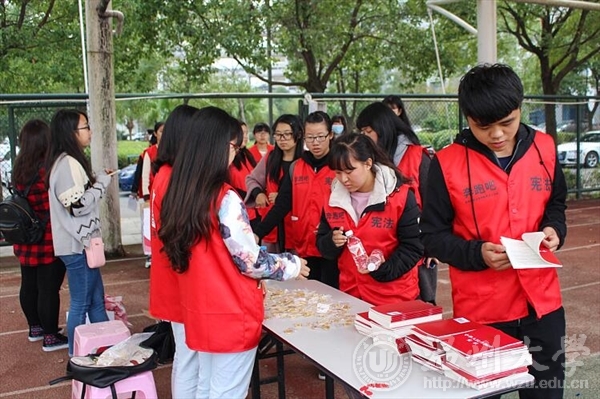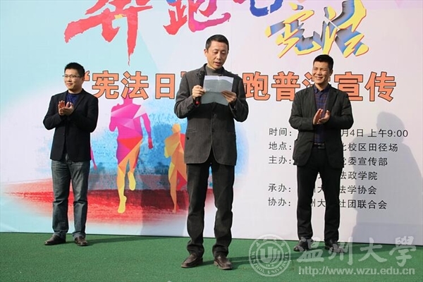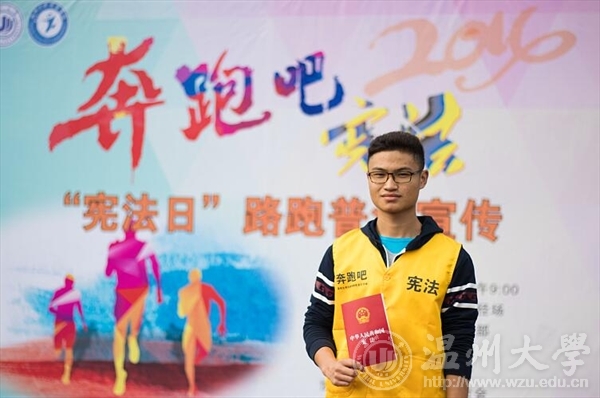 党总支书记林钦致辞,他谈到了宪法日设立的背景和意义,他说12月4日是我国的宪法日,设立国家宪法日,是推进宪法宣传教育、弘扬宪法精神、加强宪法实施的重要举措,也是增强法治观念、弘扬法治精神、夯实法治基础的有效途径,"奔跑吧,宪法"活动正是为了迎接这一特殊的日子而举办的,师生精心策划的本次活动将宣传宪法日与跑步结合起来别出心裁,希望全体参与者能够践行本次活动的宗旨——让宪法跑进生活,让宪法跑进心里!在学生代表宣誓和慢跑热身活动后本次路跑活动正式开始,路跑的终点处每一位参与者都领取了一本纪念版《中华人民共和国宪法》和本次路跑活动纪念徽章。