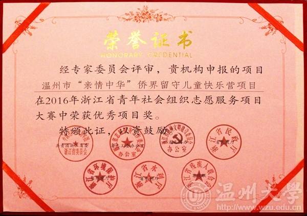 2016年9月8日,2016年浙江省青年社会组织志愿服务项目大赛在杭州举行,来自浙江省各地区、各高校的120个项目参赛,法政av天堂 学生社团的"关爱侨界留守儿童项目"荣获浙江省青年社会组织志愿服务优秀项目奖。