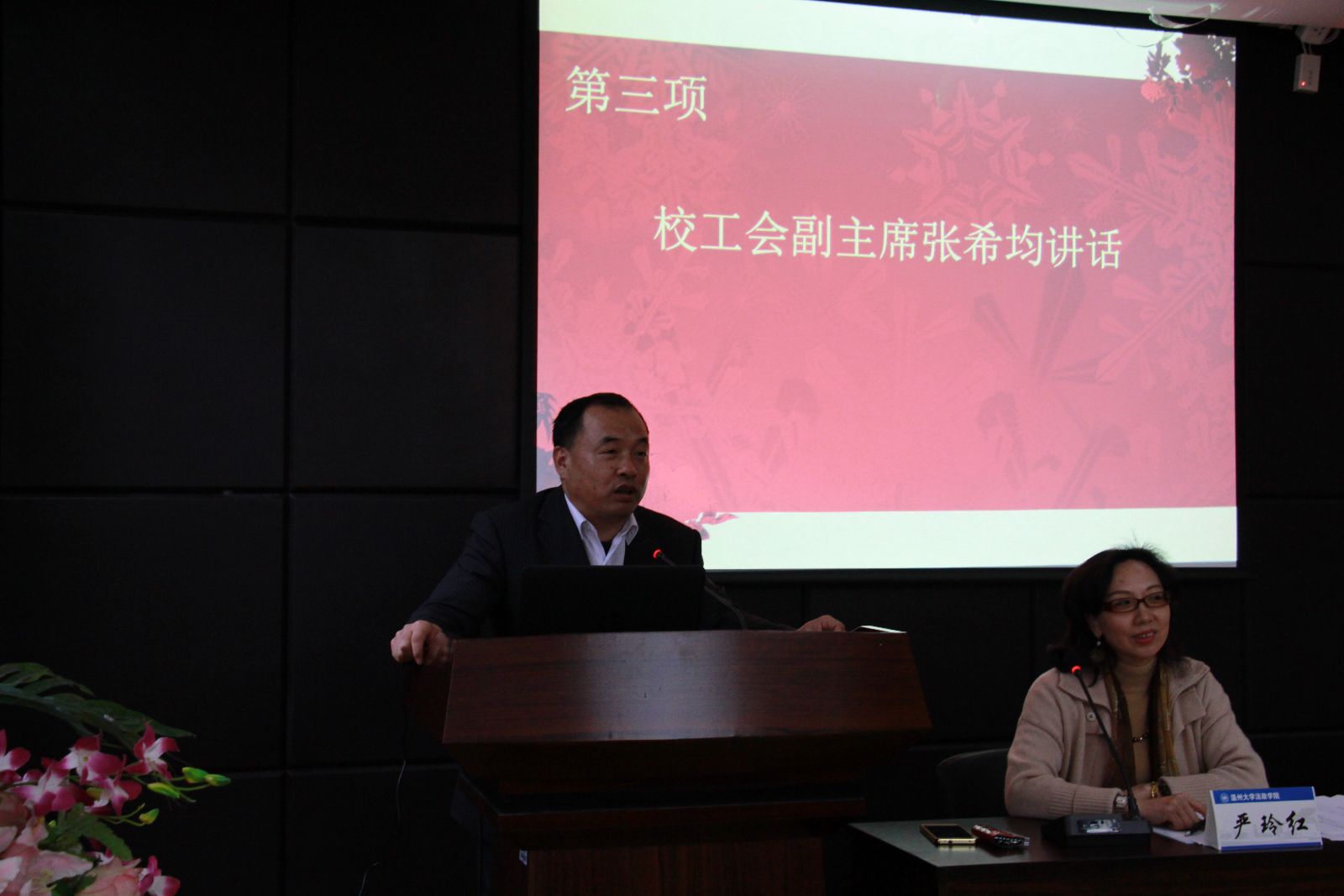 2016年1月8日下午两点,法政av天堂 在av天堂 报告厅召开了四届教职工暨工会会员大会,大会由院党总支副书记严玲红主持。学校工会主席张希均全程列席了会议,并作重要讲话。