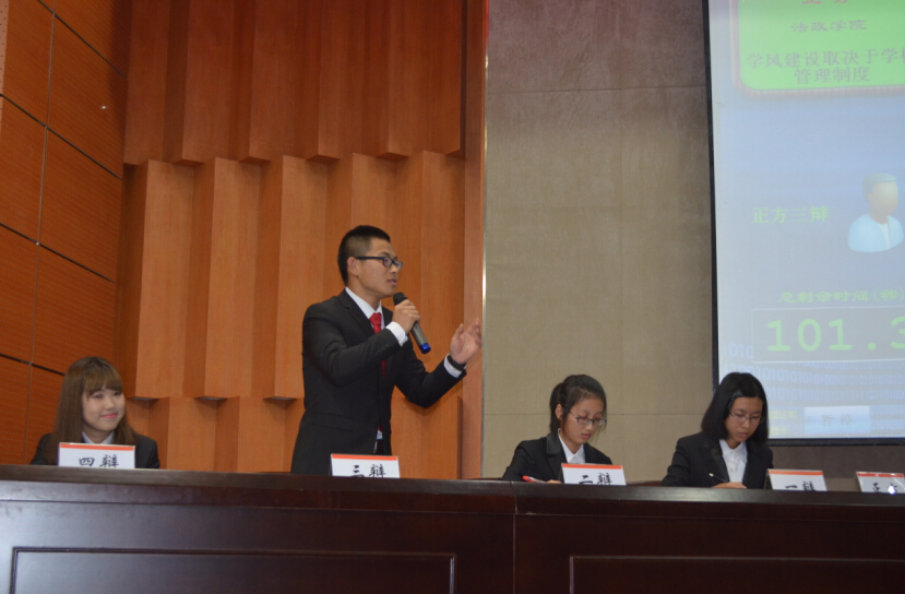 2015年11月29日下午,av天堂 南校区岩松堂雁山厅分外热闹,来自av天堂 商av天堂 、法政av天堂 、物理与电子信息工程av天堂 、生命与环境科学av天堂 的四支辩论代表队齐聚一堂,为现场观众展现了辩论的魅力。