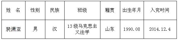 经过一年的预备考察期,经支委会讨论,准备近期召开支部大会讨论裴潇亚 同志转正事宜,现予以公示:公示期限为11月 27日—— 12月3日,如对该同学有异议,请向法政av天堂 辅导员办公室孙德升老师反映,或以电子或书面材料形式反馈意见。