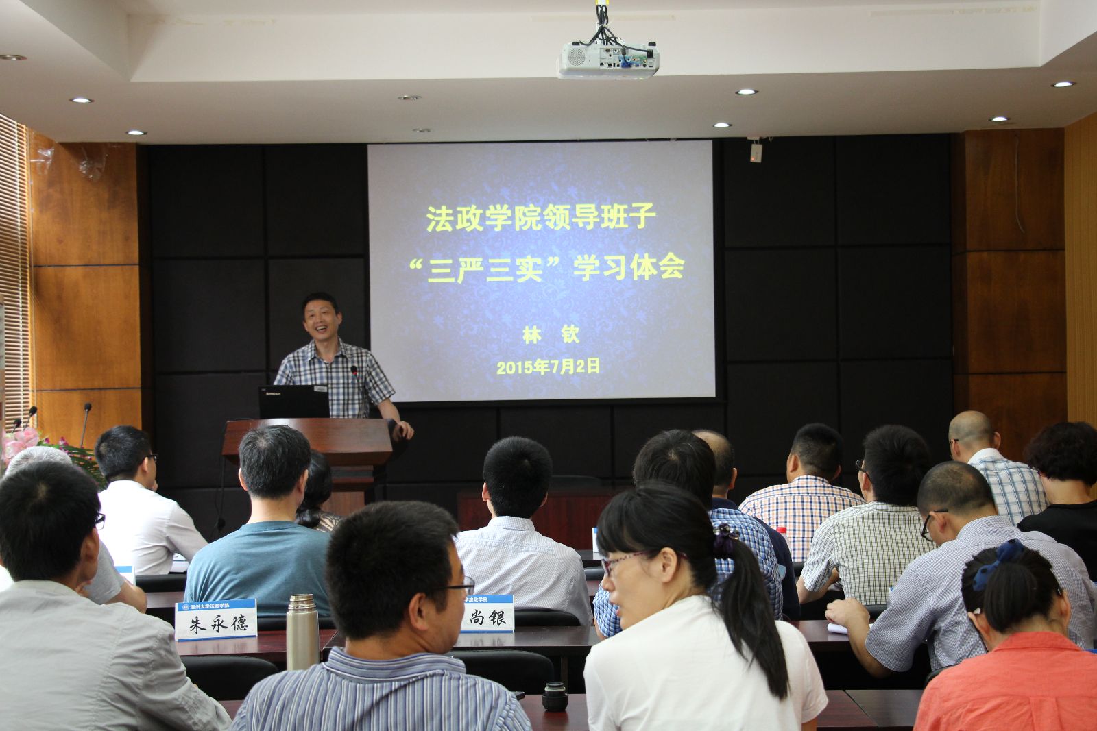 2015年7月2日下午法政av天堂 全体教职工对习近平总书记就深入推进作风建设,对各级领导干部提出"严以修身、严以用权、严以律己,谋事要实、创业要实、做人要实"的精神进行深入学习。会议由王宗正院长主持,林钦书记做主题报告。