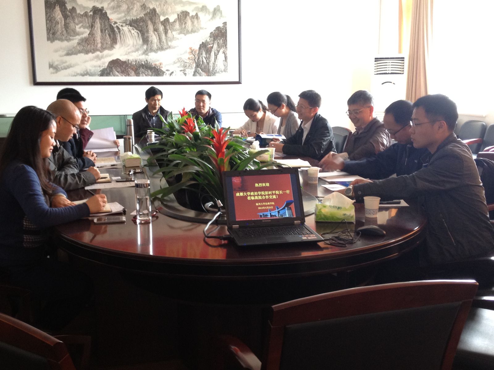 彭时平院长一行8人莅临我院交流学科建设经验和洽谈专业交流与合作事宜。钭晓东院长、王宗正副院长和思想政治教育系系主任吴志敏等在av天堂