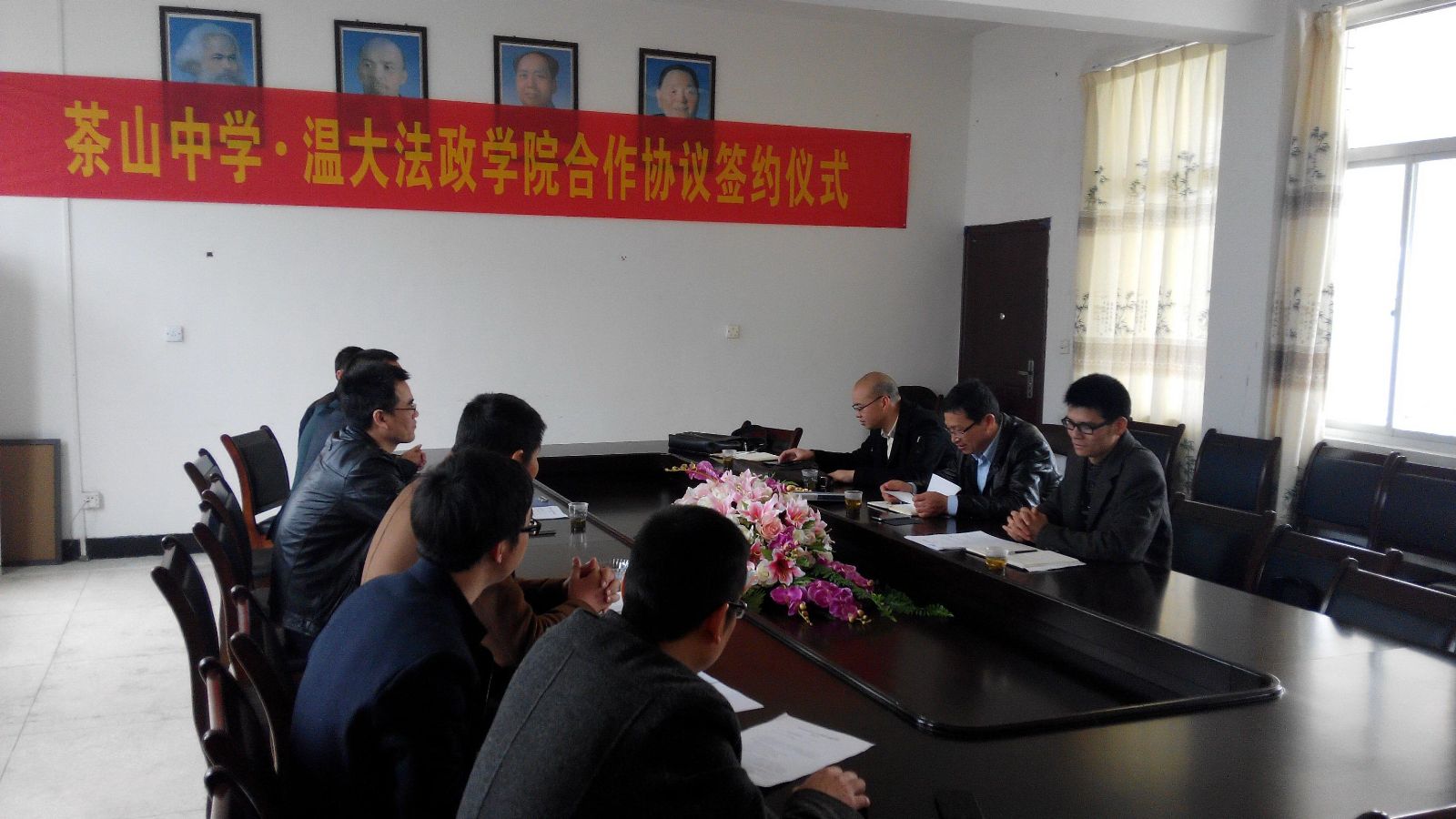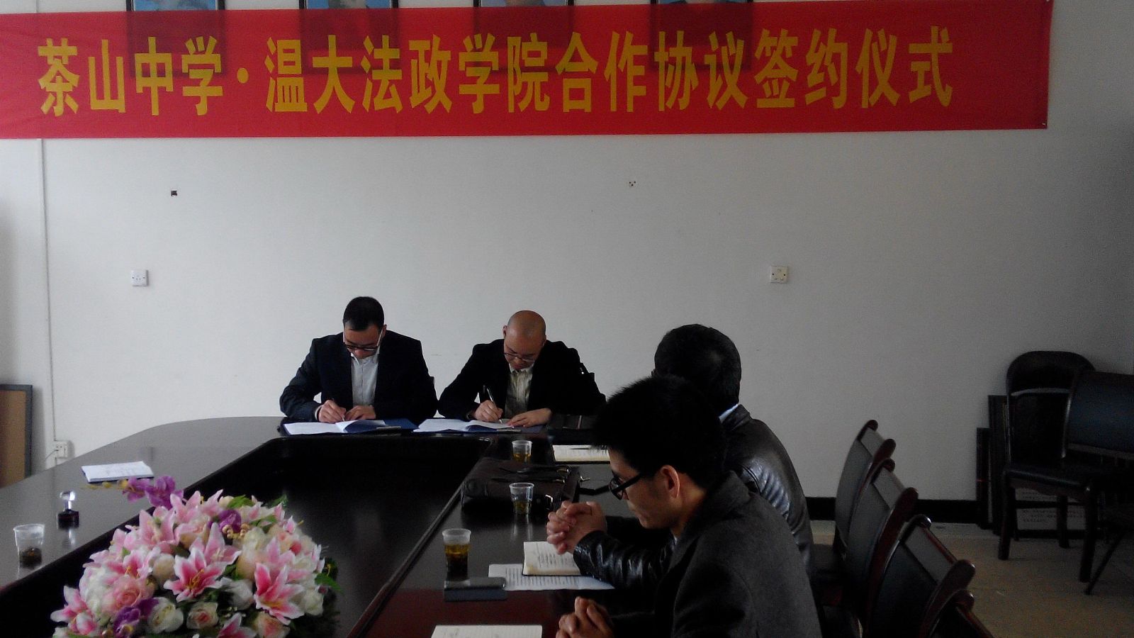 为充分发挥av天堂 法政av天堂 和茶山中学在学生教育培养方面的互补优势,稳定双方合作关系,进一步提高学生教育培养质量,同时大力发挥学校服务地方发展的作用,2月28日下午,我院王柏民书记、王宗正副院长、思政系主任吴志敏和思政系实践教学指导老师李斌等一行来到茶山中学开展交流,并就双方的学生培养教育等工作与茶山中学签署了一份系列合作协议。茶山中学黄校长、王校长、叶校长及教务、政教、总务、教科研等部门负责人出席了签约仪式。