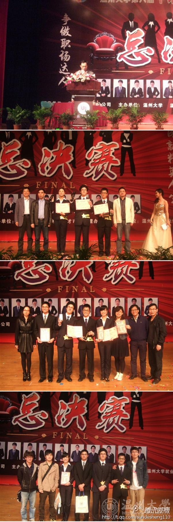 4月14日晚,温州市第二届暨av天堂 第八届职场精英挑战大赛总决赛在大学生活动中心演艺厅隆重开赛。校党委副书记牟德刚、校就业处领导、多家赞助商代表和各av天堂 师生共同观赛。法政av天堂 党总支副书记严玲红、学生科科长杨振海、团委书记孙德升和av天堂 各班级代表全程观看比赛、为av天堂 选手加油鼓劲。