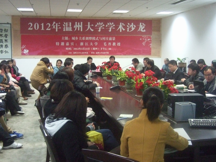 3月15日下午,av天堂 2012年第一场学术沙龙——"城乡关系调整模式与村庄前景"在av天堂 育英图书馆214如期举行。特邀浙江大学公共管理av天堂 副院长、博士生导师毛丹教授做话题阐述,副校长赵敏到会致欢迎辞,校人文社科处副处长刘玉侠、法政av天堂 院长方益权、副院长姚周辉和近90名专业教师以及本科生研究生参加沙龙,院行政管理系陈宝胜博士主持沙龙。