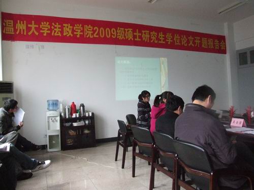 上午8时30分,开题报告会在法政楼309教室举行。开题报告会由硕士点负责人李炳安教授主持,评议组组长由特邀专家温州医av天堂 社科部主任杨华教授担任。校党委副书记牟德刚教授、研究生部部长陈安金教授、副院长姚周辉教授以及吴玉宗教授、李业杰教授、王尚银教授、陈国治教授,2010级硕士研究生参加了本次报告会。