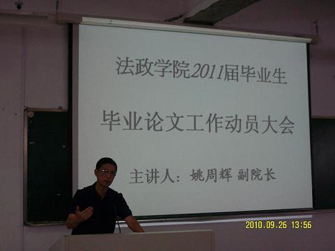 :00,在2-203教室,法政av天堂 召开了2011届毕业生毕业论文工作动员大会,会上姚周辉副院长着重讲了毕业生撰写毕业论文的重要性、要求及我院毕业论文工作的具体安排,要求同学们要按照具体安排完成每一个阶段的论文撰写工作,并向同学们介绍了我院往届毕业生的毕业论文建设情况。指出我院的教师历来具有较强的科研与指导学生科研的能力,而且我院毕业生毕业论文在省高校抽查曾经获第一、二名的好成绩。最后对本届毕业生提出殷切希望:2011届同学通过师生的共同努力能够再创新绩。