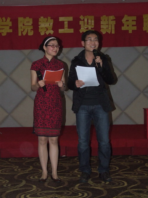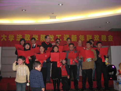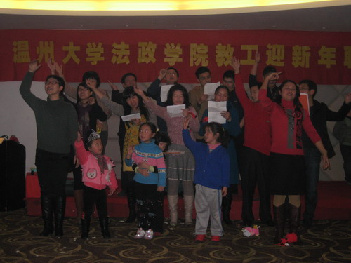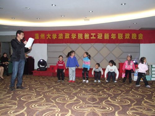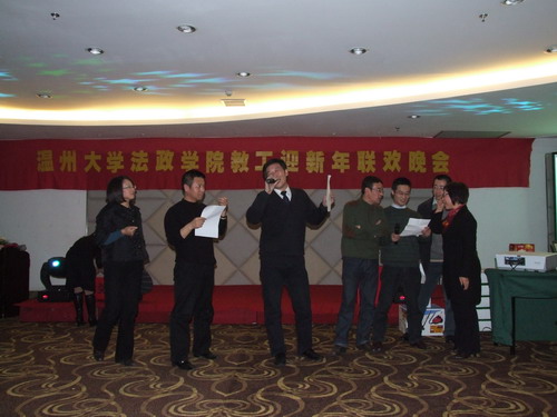 的传统。在2008年的最后一天,我们带着兴奋和期盼的心情在红太阳宾馆举行了迎新年联欢晚会。 晚会首先由蔡克骄院长作新年致辞,在孙德升和孙慧两位主持人的引领下,精彩节目和游戏陆续登场,掀起一个又一个的高潮。去年迎新年晚会的精彩回顾让我们回想起去年的美好记忆,全场禁不住开怀大笑;余惠老师深情演唱了《前门情思大碗茶》,赢得一片掌声;政治与原理组的老师们用各地方言演绎了由李业杰教授创作的《花》,构成了精彩的节目《南腔北调说"花"》;概论与纲要组的教师们为全院教工献上了衷心的《祈祷》;法学组的全体教师用黑色毛衣、红色围巾的统一着装和饱含情感的声音阐释了《面朝大海 春暖花开》;行管与基础组的老师们合唱了一首《感恩的心》,并配上了手语,成为了晚会的又一亮点;小朋友出色的表演也给晚会添上了浓浓的亲情色彩;游戏《疯狂大搜集》则把现场的气氛推向了最高潮。陈安金、余增荣等校领导也应邀参加了晚会,并纷纷表演了自己的拿手好戏。晚会现场欢笑声、喝彩声不绝于耳,洋溢着浓浓团结友爱的氛围和节日的喜庆气氛。 让我们期待着明年的相聚,让我们共同祝愿2009年的法政av天堂 将更加美好!