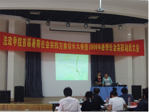 5月14日晚6:30,法政av天堂 首届暑期社会实践方案设计大赛决赛答辩会暨2008年暑期社会实践动员大会在大学生活动中心多功能厅隆重举行,共有8支队伍参与角逐。法政av天堂 党总支书记陈国治老师、副院长朱选华老师和辅导员林丽丽老师观看了当晚的答辩会并担任了评委。此外,大会也邀请了07年暑期社会实践队伍的负责人潘海斌、陈懿、戈文君以及商av天堂 、体育av天堂 实践部负责人池卢晓、汪伟新同学担任学生评委。全体大一学生参加了此次活动。 首先,林丽丽老师总结了去年我院暑期社会实践的情况。去年,我院共组建了15支实践队伍并且成绩突出,成果丰富:1支实践队伍荣获省级优秀实践队,4支获校优秀实践队,5支被评为院优秀实践队,共32名实践队员获得校先进个人,1名省先进个人和一名市先进个人。因此,她更加期待今年的暑期社会实践。 接着,陈书记做了动员宣言。他指出作为法政av天堂 的学生,能将自己所学的专业知识和社会实践结合起来,这是很好的,也体现了大学生高度的社会责任感。此外,在积极投身实践的同时,更要注意安全。 之后,就是精彩的比赛时间。每支队伍都有5分钟的策划介绍时间,在这5分钟的时间,各队负责人利用多媒体向评委和观众尽可能多地介绍自己的团队、策划目的、策划意义、预期的成果以及可行性分析。从介绍情况来看,同学们的主题涉及了法律援助、构建和谐社会、新农村建设等等,十分广泛。策划介绍后,是答辩时间,评委多从经费来源和专业性角度来提问,选手们妙语连珠的回答使现场气氛达到了白热化。 经过一系列激烈的角逐,"和谐之旅——探索社会主义新农村绿色发展道路"实践队以85.12的比分获得了一等奖,av天堂 "守梦廊桥"实践队、"传播法制理念,提供法律援助"咨询服务队获得二等奖,"‘励青之行’08av天堂 暑期社会实践队等三支队伍获得了三等奖。 最后,由朱院长做当晚的总结发言。他指出,同学们的策划都是考虑细致且较成熟的,有较高的可行性,并对人力资源做了合理的分配,体现了法政av天堂 学生的时代性和政治敏感性。他也提醒参赛队伍要突出中心主题,不要把实践目标定得太高,并且实践队伍能真正服务于社会。 在此,我们也预祝08年暑期社会实践能取得圆满成功!