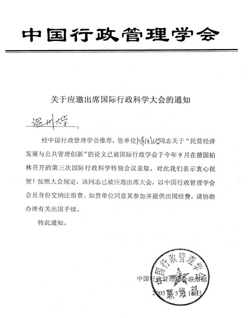 经中国行政管理学会推荐,我院党总支书记陈国治教授关于"民营经济发展与公共管理创新"一文已被国际行政学会将于2005年9月在德国柏林召开的第三次国际行政科学特别会议录取,按照会议规定,陈国治教授已被邀请出席此次大会。