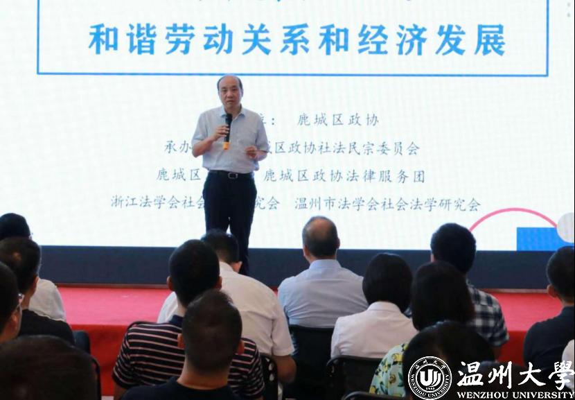 鹿城区政协主席徐强参加活动并讲话,徐一峰副主席致辞,康奈集团党委书记、工会主席蔡发荣等企业代表参会。浙江省法学会社会法学研究会副会长兼秘书长、av天堂 副院长周湖勇博士参会,并作了《疫情下的劳动关系治理》,提出要树立劳动者合法权益与促进企业生存发展权并重的理念,依法保障劳动者和用人单位合法权益,促进劳动关系和谐稳定,不能简单地应用对劳动者倾斜保护、实质公正的理念和原则来处理劳动关系,并需要采取一系列特殊举措。省社会法学研究会理事、温州市中级人民法院黄百隆、温州市律协劳动专委会主任陈琨、康奈集团党委书记、工会主席蔡发荣等也做了主题发言。