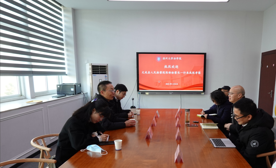 2021年1月8日上午,文成县人民检察院陈锋检察长、副检察长陈伟银、苗东欣一行三人来访我院,在参观我院后双方在av天堂 314会议室举行了座谈会。我院王宗正院长、缪心毫副院长、谢丽珍老师、肖磊老师、周浩仁老师参加座谈。