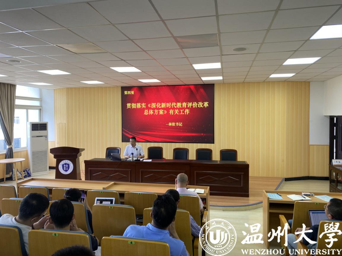 会议议程第四项是由林钦书记做贯彻落实《深化新时代教育评价改革总体方案》有关工作的主题宣讲。林钦书记从背景和意义、主要内容和精神、贯彻落实三个方面对《深化新时代教育评价改革总体方案》进行了解读,同时指出该方案是指引教育发展方向的旗帜性、灯塔性文件。