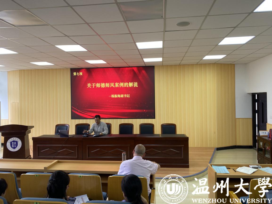会议议程第七项是由杨振海副书记做师德师风案例的解说。杨振海副书记从信仰缺失,政治观念淡薄;学术腐败,自学态度不端正;自律不严,生活作风糜烂三个方面的典型案例提醒各位老师要注意师德师风建设,要执着于教书育人,有热爱教育的定力、淡泊名利的坚守,要有理想信念、有道德情操、有扎实学识、有仁爱之心。