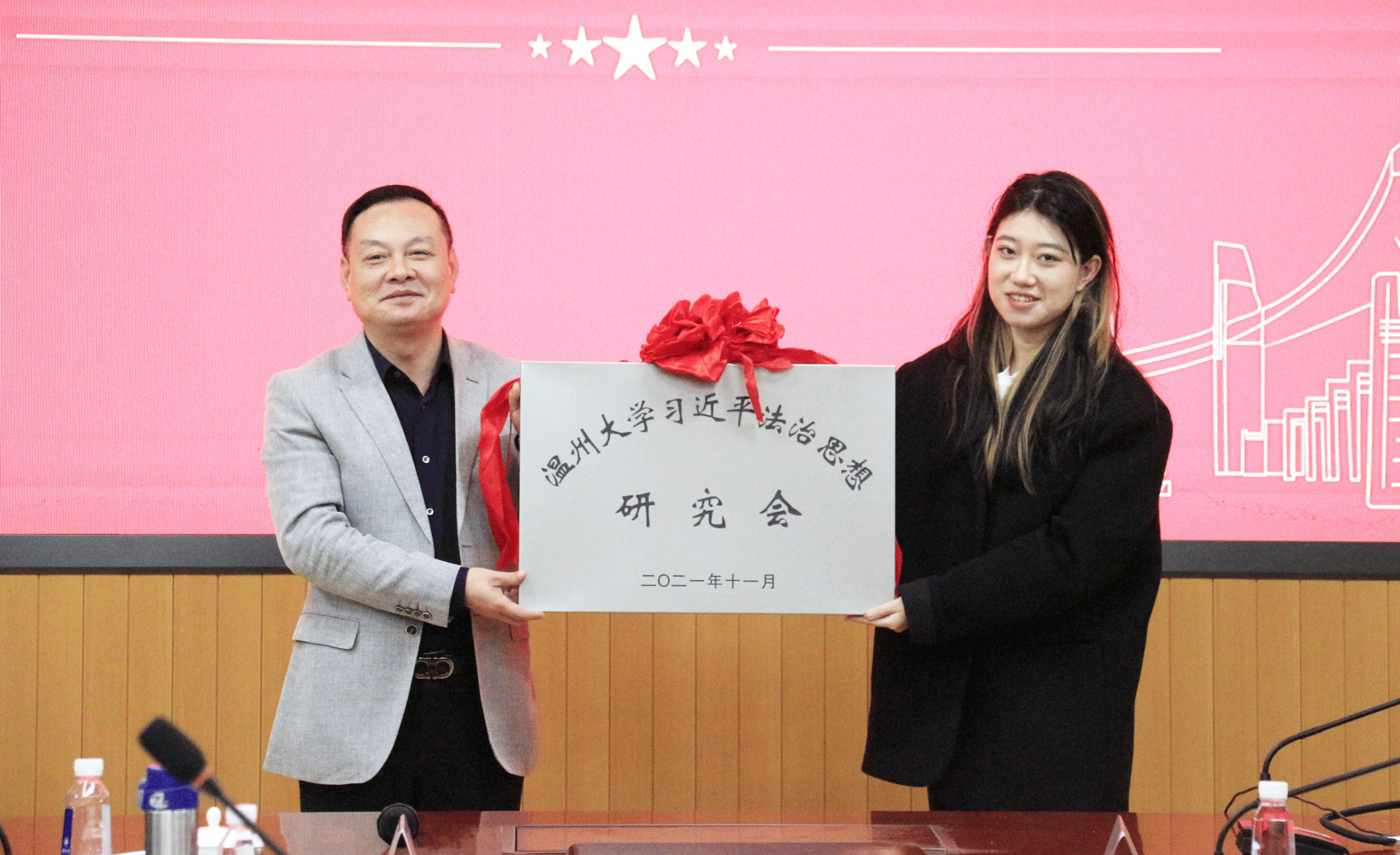 校团委副书记易招娣宣读了成立“av天堂 习近平法治思想研究会”的决定,校党委委员、宣传部部长潘玉驹为该研究会授牌。