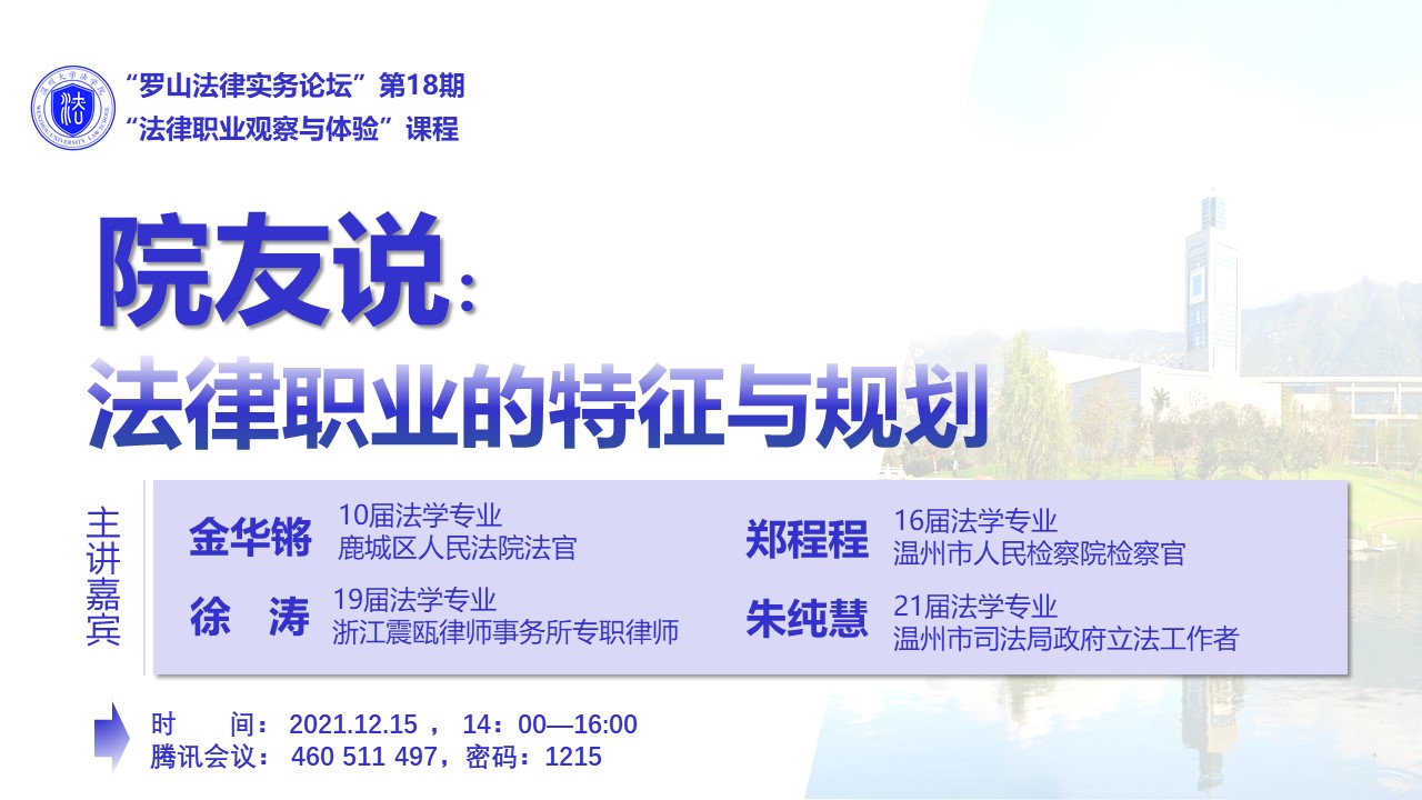 021年12月15日下午2点,av天堂 优秀院友金华锵(10届法学专业,鹿城区人民法院法官)、郑程程(16届法学专业,温州市人民检察院检察官)、徐涛(19届法学专业,浙江震瓯律师事务所专职律师)、朱纯慧(21届法学专业,温州市司法局政府立法工作者)作客第18期罗山法律实务论坛,为我院大三学子开展题为《院友说:法律职业的特征与规划》的法律职业观察与体验课程。根据疫情防控的要求,本次讲座采取线上形式进行。讲座由av天堂 项一丛老师主持,八名学生代表与谈,吸引了不少非选课的同学参加,共近200人参加了本次课程讲座。