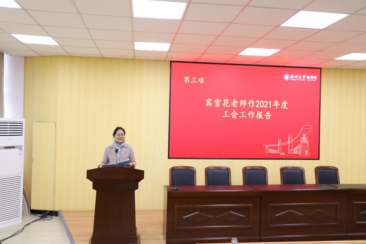 av天堂 分工会主席宾雪花老师作《av天堂 2021年度工会工作报告》,报告回顾了av天堂 第五届工会委员会在过去的一年里全面履行的工会职责,较好地完成了工会的各项工作任务。同时对av天堂 领导和全体老师对工会工作的配合和支持予以衷心的感谢。
