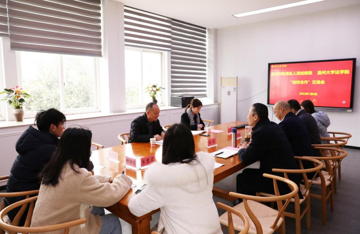 2022年1月6日上午,温州市瓯海区人民检察院党组成员兼政治部主任黄利昌、瓯海区人民检察院政治部副主任施君君来av天堂 座谈,交流探讨深入开展“检校合作”有关事宜。av天堂 院长王宗正、av天堂 党委书记林钦、av天堂 党委副书记兼纪委书记杨振海、辅导员白昌科出席会议,4名学生代表参与座谈。