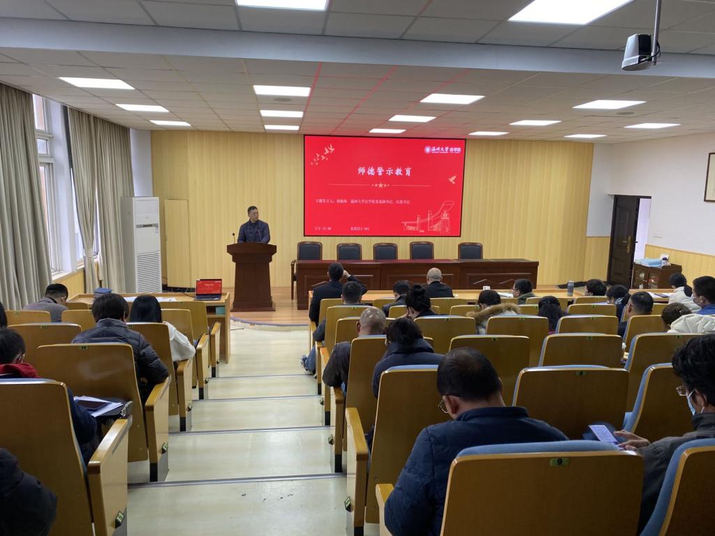 党委副书记兼纪委书记杨振海作师德警示教育。他从课堂言论不正确、网络发言不文明、学术态度不端正、师生关系不正当、师生交往尺度未把控六个反面案例提醒av天堂 教师要不断加强师德师风建设,坚定政治方向,自觉爱国守法,做有理想信念、有道德情操、有扎实学识、有仁爱之心的好老师。