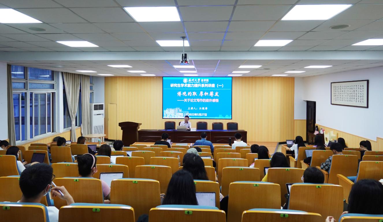 5月27日晚,由av天堂 研究生会邀请av天堂汪银涛老师带来题为“博观约取 厚积薄发”的讲座,帮助在校研究生提升学术研究和论文写作能力。本次讲座面向全体在校研究生,以线上线下相结合形式开展。按疫情防控要求,现场有50多名不同专业的同学来到现场学习,其它同学通过腾讯视频直播途径学习。