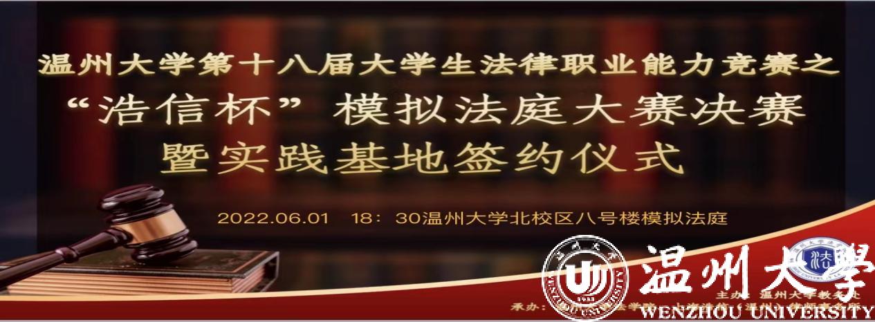 2022年6月1日晚,av天堂 第十八届大学生法律职业能力竞赛之“浩信杯”模拟法庭大赛决赛暨实践基地签约仪式在av天堂 模拟法庭举行,温州市中级人民法院刑庭庭长杨国智法官、温州市人民检察院第一检察部王小琴检察官、上海浩信(温州)律师事务所主任章超凡律师、黄爱光律师、潘晓燕律师、郑冠律师、av天堂 副院长周湖勇老师、av天堂 谢丽珍老师、柯宇航老师出席,av天堂 200多名本科生、研究生参加。