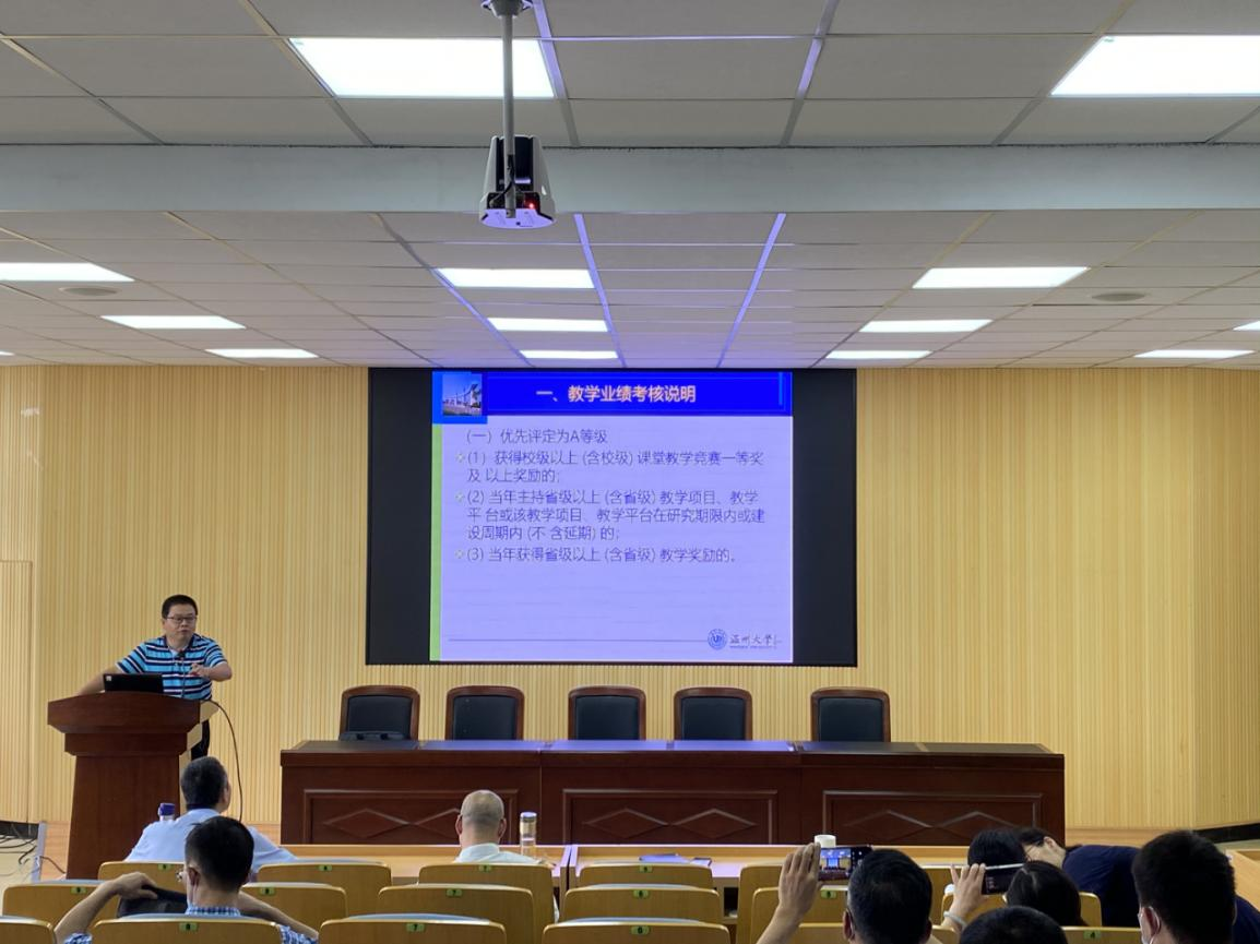 av天堂 副院长周湖勇作教学事项相关安排。他对教学业绩考核与试卷批改规范进行了介绍。