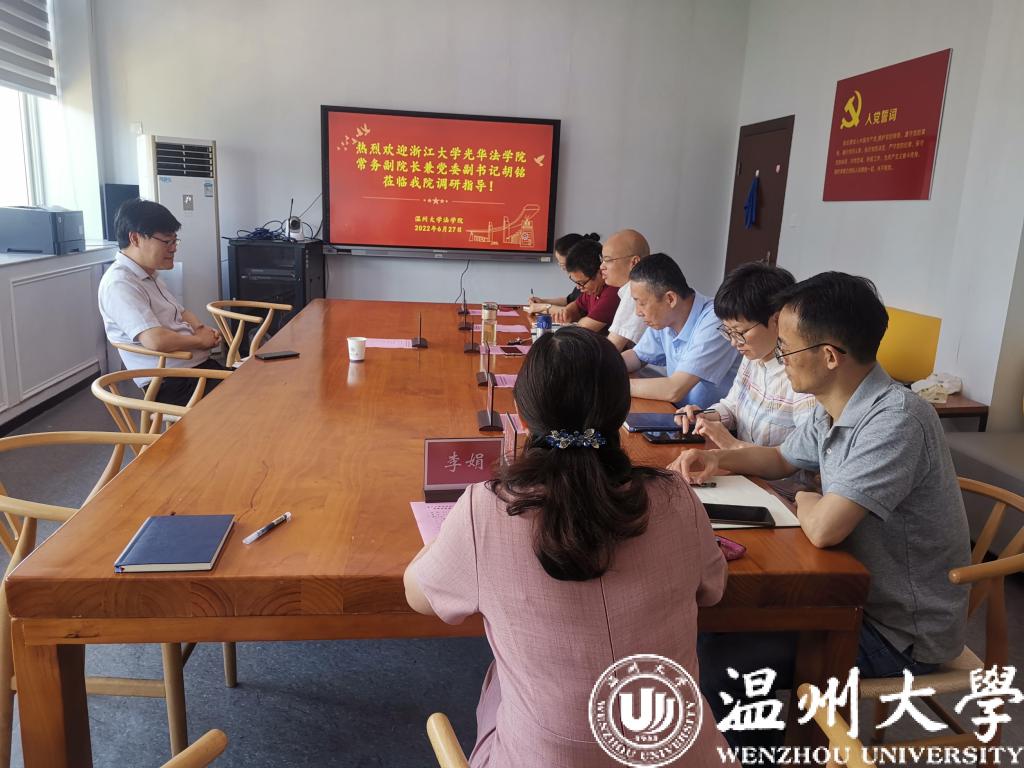 6月27日上午,浙江大学光华av天堂 常务副院长兼党委副书记胡铭莅临我院调研指导,av天堂 院长王宗正等领导和法学相关系主任出席座谈会。