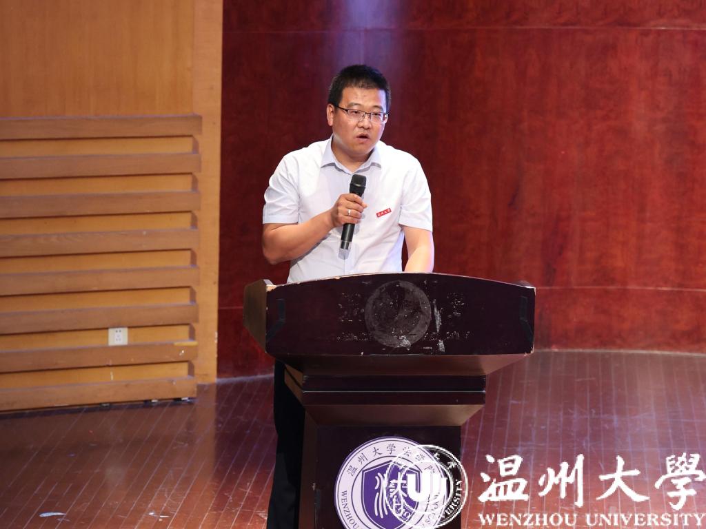 随后袁士杰老师作为教师代表上台发言,提出辩证看待“上了大学就解放和自由了”的观点,鼓励新生坚持顽强坚韧的奋斗脚步,赢得真正自由且幸福的生活,并提出“自主自省自信”三自原则,作出了一名教师的庄严承诺。