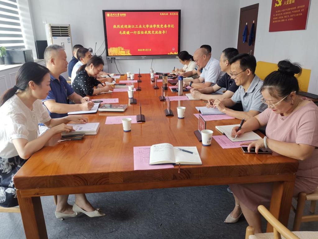 9月22日下午,浙江工业大学av天堂 党委书记毛筱媛、副院长张友连、证据实验室主任吴习彧、办公室主任高周荣等一行莅临我院交流座谈,av天堂 院长王宗正、党委书记林钦、副院长周湖勇、民商经济法系主任李勇军、法律系主任谢丽珍、国际经济法系主任李娟、办公室主任刘小芬等出席座谈会。