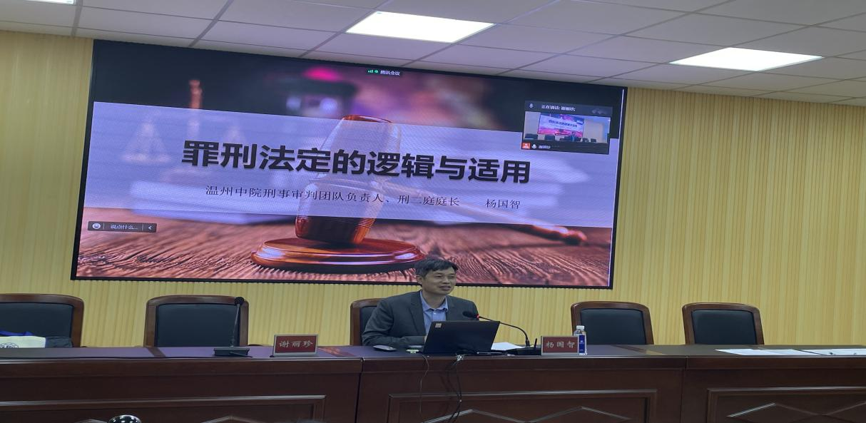 2022年11月15日晚6点半,温州中院刑事审判团队负责人、刑二庭庭长杨国智为av天堂 师生带来题为《罪刑法定的逻辑与适用》的讲座。本次讲座由av天堂 谢丽珍老师主持,采取了线上线下相结合的方式,在北校区av天堂 301教室和腾讯会议直播间,部分21级研究生、22级研究生及全体20级法学本科生共有三百余人参加了此次讲座。