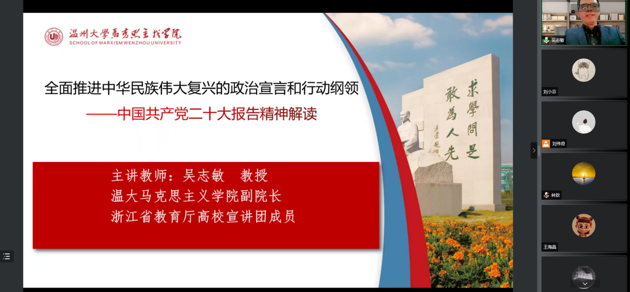 马克思主义av天堂 副院长吴志敏作全面推进中华民族伟大复兴的政治宣言和行动纲领——中国共产党二十大报告精神解读。他从中国共产党第二十次全国代表大会基本概况、中国共产党第二十次全国代表大会报告内容、学习贯彻党的二十大精神的“五个牢牢把牢”三个方面对中国共产党二十大报告精神进行了解读。他指出,我们要牢牢把握过去5年工作和新时代10年伟大改革的重大意义,牢牢把握新时代中国特色社会主义思想的世界观和方法论,牢牢把握以中国式现代化推进中华民族伟大复兴的使命任务,牢牢把握以伟大自我革命引领伟大社会革命的重要要求,牢牢把握团结奋斗的时代要求。