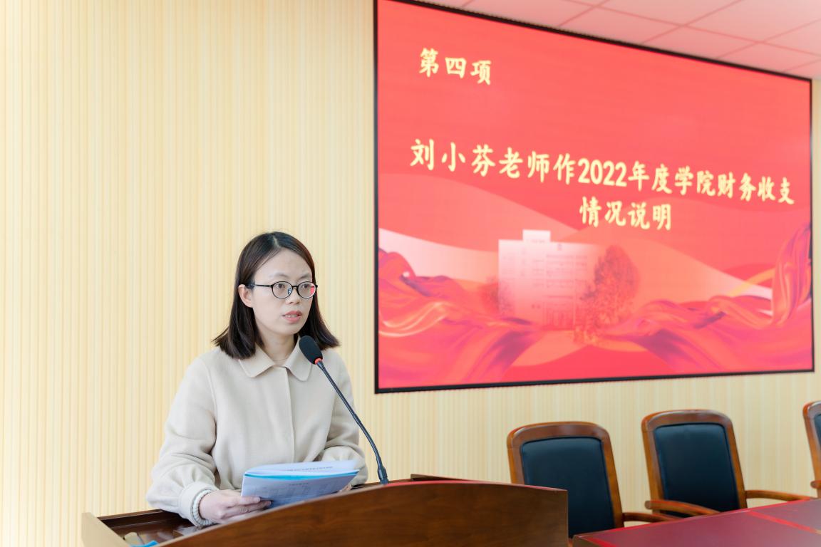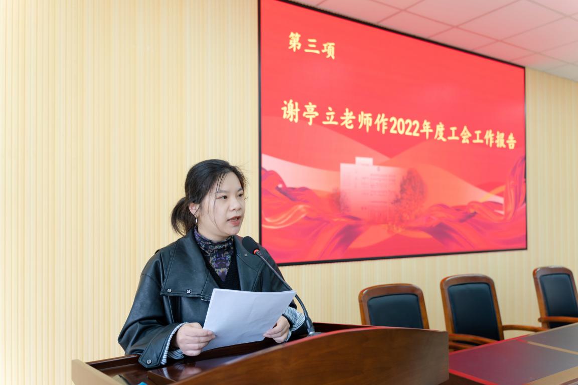 av天堂 分工会委员谢亭立作《av天堂 2022年度工会工作报告》,报告回顾了av天堂 第五届工会委员会在过去的一年里全面履行的工会职责,较好地完成了工会的各项工作任务。同时对av天堂 领导和全体老师对工会工作的配合和支持予以衷心的感谢。