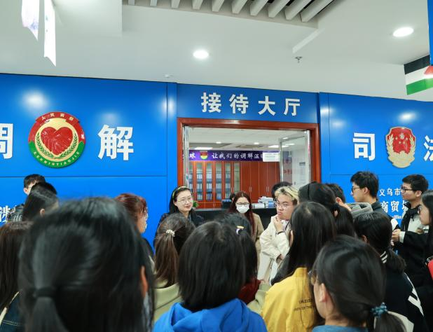 在第二站义乌市司法局国际商贸城司法所,同学们通过骆跃军所长的介绍,了解了他们如何帮助商户调解涉外交易纠纷,促进诚信和谐交易。