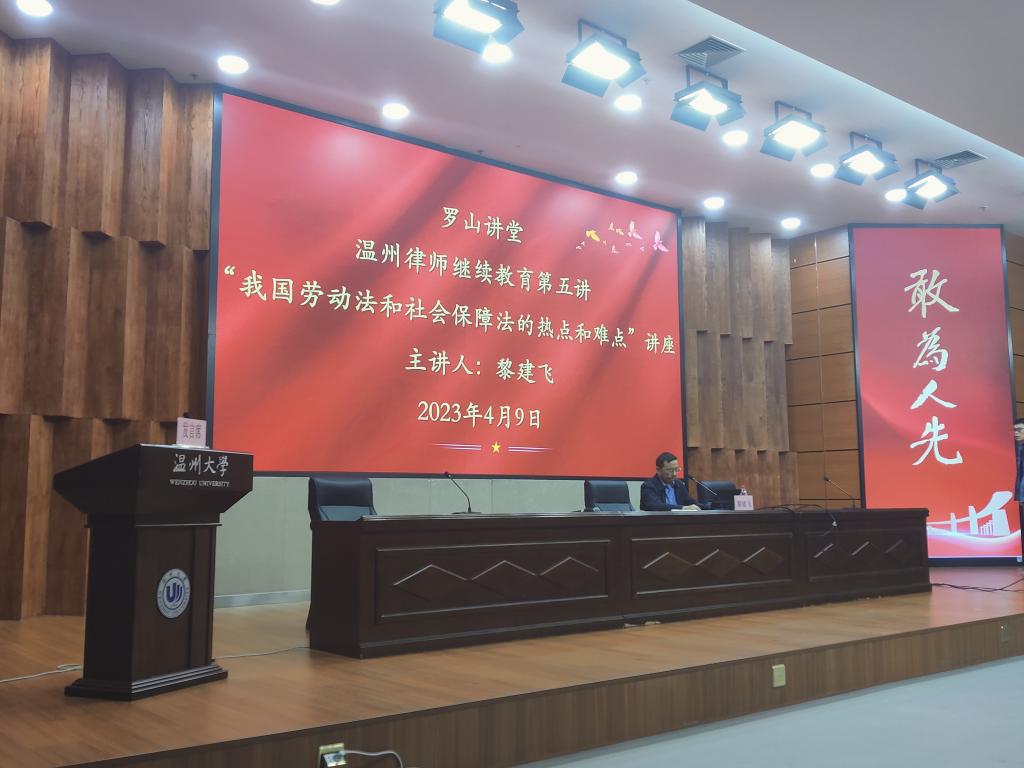 2023年4月9日下午,中国人民大学av天堂 教授、博导黎建飞老师受邀作客av天堂 罗山讲堂,在南校区岩松堂雁山厅做题为《我国劳动法和社会保障法的热点和难点》的讲座。参加此次讲座的人员除了我校师生外,还有来自温州市中级人民法院、温州市人社局、鹿城区人社局、温州市律师协会以及多家律师事务所的优秀法律工作者。