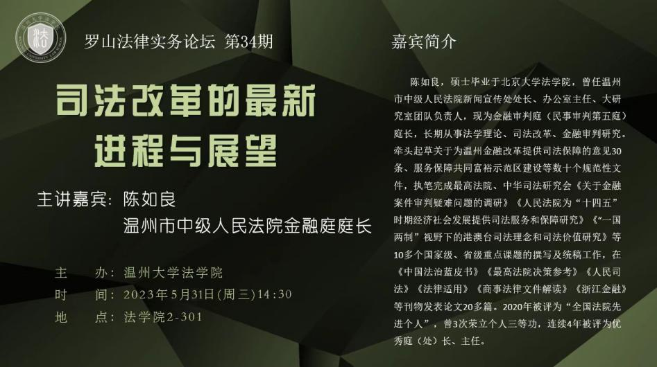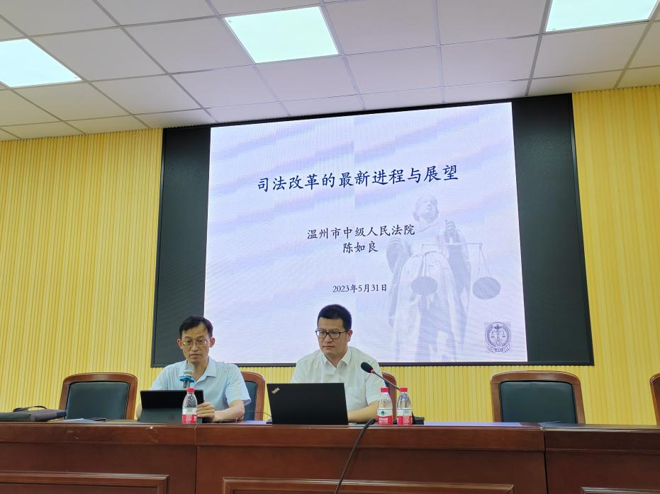 2023年5月31日下午,温州市中级人民法院金融审判庭(民事审判第五庭)庭长陈如良应邀作客罗山法律实务论坛,为av天堂 师生作专题讲座。本次讲座主题为“司法改革的最新进程与展望”,讲座由av天堂 法学专业负责人、民商经济法系主任李勇军老师主持。