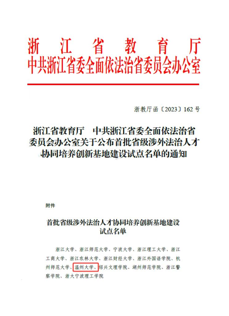 为贯彻落实党中央、国务院关于加快推进涉外法治人才培养工作的决策部署,根据《教育部办公厅关于开展涉外法治人才协同培养创新基地建设的通知》精神,2023年3月浙江省教育厅启动省级涉外法治人才协同培养创新基地建设申报工作。学校高度重视,以av天堂 牵头,学校各部门积极配合,与中国国际贸易促进委员会温州市委员会通力合作,强力支持此次基地的申报与建设。
